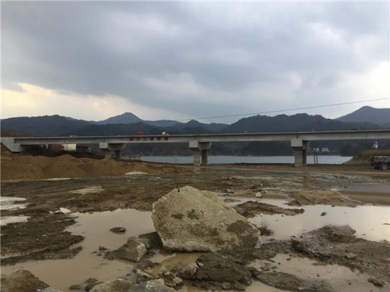11月17日晚上19時,在施工人員的密切配合下,隨著吊車的緩緩移動,最后一片T梁穩穩地落在墩臺上,至此,英山項目溢洪道交通橋T梁架設工程全部完成。